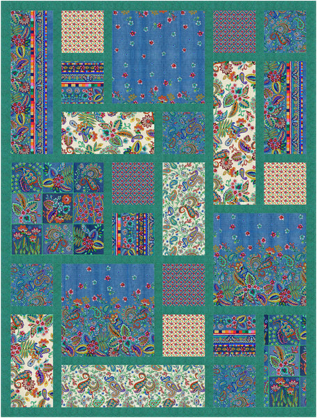 This is a larger version of my popular design, Tiles. The blocks are put together with a tonal strip on the top and right side of every patch . The quilt is then assembled in asymmetrical sections. The final step is to add a full-length border to the left side and bottom of the quilt only.
